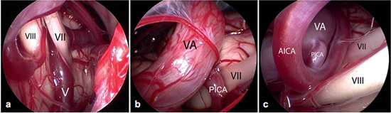 临床上通过在血管和脑干间的位置放置一个聚四氟乙烯海绵达到去压迫的目的(figure 7)。在一些复杂案例中(例如患者的血管直径过大或者血管硬化),则需要使用聚四氟乙烯吊索把产生压迫的血管缝合到硬脑膜上,这样才能够完全去除压迫。